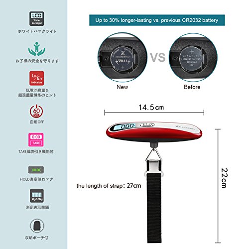 ???Specifications of digital weight scale??? *Capacity of this postal scales: 110lb (50kg) *New upgrade 3V CR2032 battery in the digital hanging scale,up to 30% longer running time than normal battery. *Backlight of these digital portable scales: white LCD display *Color of this weighing scale: Passional red digital precision scale *Graduation of this travel weight scale: .35oz/.02lb/10g 0