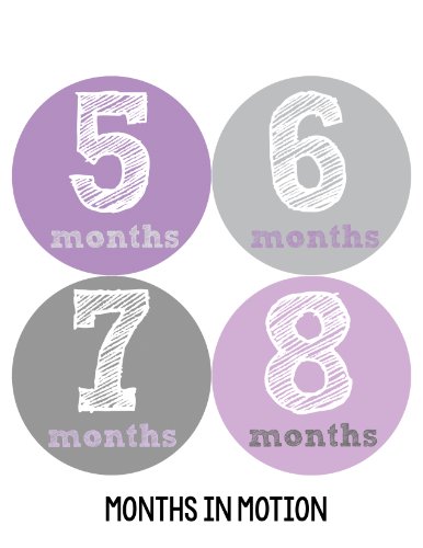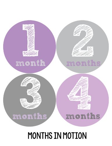 -. Binding : Baby Product -. Brand : Months In Motion -. Color : purple, grey -. Department : Baby-girls -. EAN : 0764130837140 -. Feature : Just peel, stick, and take a photo to document your baby's first year! / Makes a wonderful shower gift! / The perfect baby photo prop! / P.R.Inted on white matte sticker so no glare in photos / Includes 12 precut stickers that are approximately 3.93 inch diameter -. Label : Months In Motion -. LegalDisclaimer : Stickers are to be used under adult supervision only. Do not leave stickers on baby unattended. -. Manufacturer : Months In Motion -. Model : 215 -. PackageQuantity : 12 -. ProductGroup : Baby Product -. ProductTypeName : BABY_PRODUCT -. Publisher : Months In Motion -. Studio : Months In Motion -. Title : Months in Motion 215 Baby Month Stickers Baby Girl Months 1-12 Purple Grey -. UPC : 764130837140