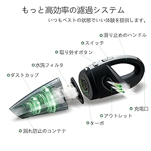 高効率の濾過システム、120W強力ルーター、HEPA標準のフィルタ(水洗可能)