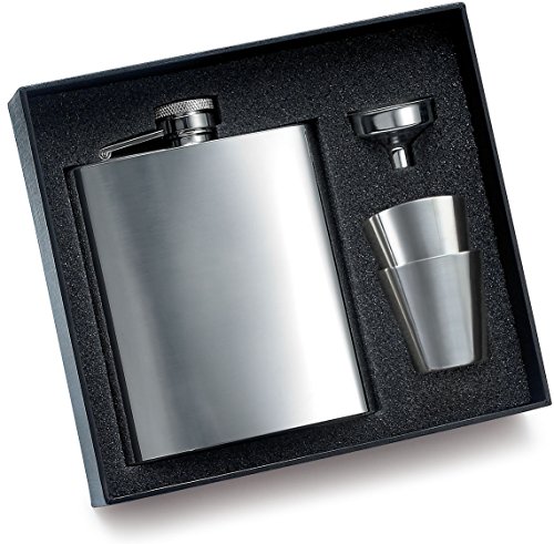 - 6 oz. Stainless Steel Hip Flask with captive top, 1 Stainless Steel Funnel and 2 Stainless Steel Shot Cups included