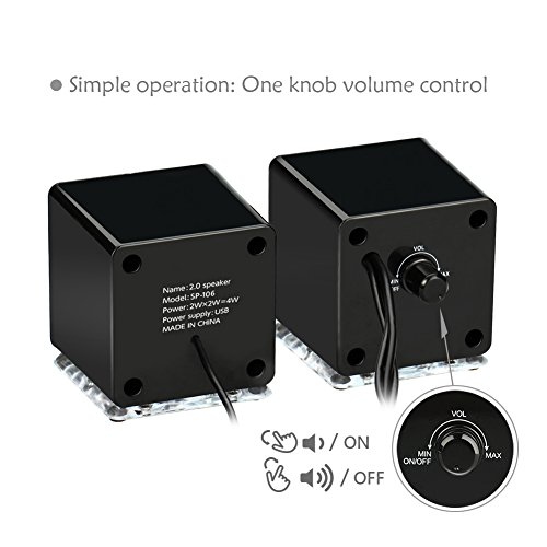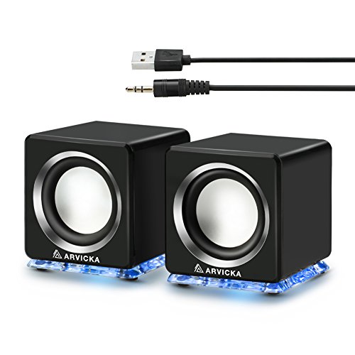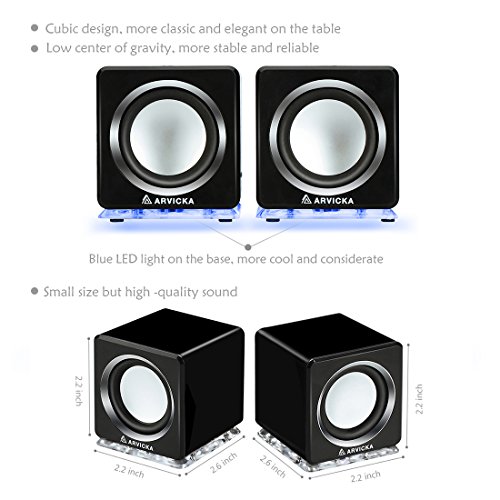 ONE KNOB VOLUME ADJUSTMENT- Arvicka AUX desktop speakers provide you a more enjoyable audio experience. Mini pc speakers come with an electrostatic protective film to ensure the well-built enclosure against any possible damage during transit. One knob control on the back of one LED speaker for adjusting the high/low volume super easily.