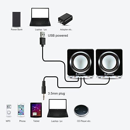 EXCEPTIONAL PERFORMANCE- The SP-106 laptop speakers deliver powerful sound for your PC, Echo Dot, monitor, smartphone. With ARVICKA USB powered computer speakers you can not only get clear audio but also high and low sound all easy access. The sounds fill the room better with ARVICKA USB speakers. The volume can go pretty high which good for cinephiles and misic lovers.