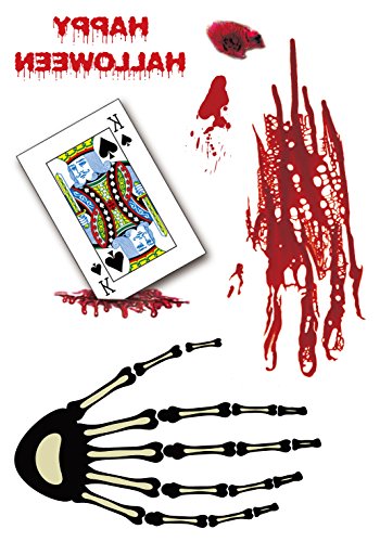 -. Feature : 6+1 Premium Sheets Included --- 60+ different designs, 6 big terror theme tattoos (6 x 4.1 inches) & one 3D look butterfly tattoos (4.1 x 2.4 inches) / Easy to Apply and Long Lasting --- These tattoos are easy to use, waterproof and can last for several days according to the position you stick / Unbelievably Realistic Looking --- Scars seem very true and natural. Attach them to your arms, waist, chest, neck, back, legs, etc. Paste in any position you like / Toxic Free and Skin Friendly --- These wounds and blood tattoos are made from non-toxic materials and all are compliance with international standards / Perfect Cosplay Makeup Kits --- These horror tattoos are great plus for Halloween parties, AP.R.Il Fools' Day, zombie or vampire cosplay or just having fun!