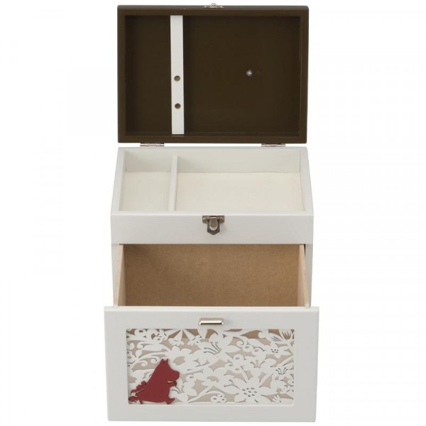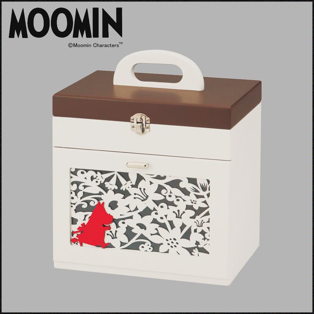 ムーミンママのシルエットが可愛い♪ご家庭の常備薬や小物類を収納できる救急箱です。上段には仕切りがあり小物の整頓に便利!!ふたの裏にはピンセットさしが付いています。引き出しのムーミンママと花柄の型抜きも素敵なアクセントに♪型抜き部分へは、中に埃などが入らないように内側から透明のアクリル樹脂を貼っています。 |