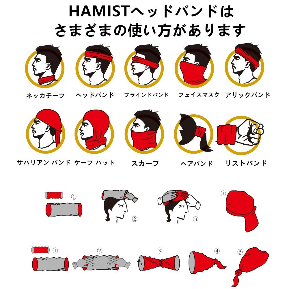Face mask / dustproof, handkerchief, sweat wipe, hair band, wristband, balaclava, neck scarf, neck warmer, bandana etc can also be used.