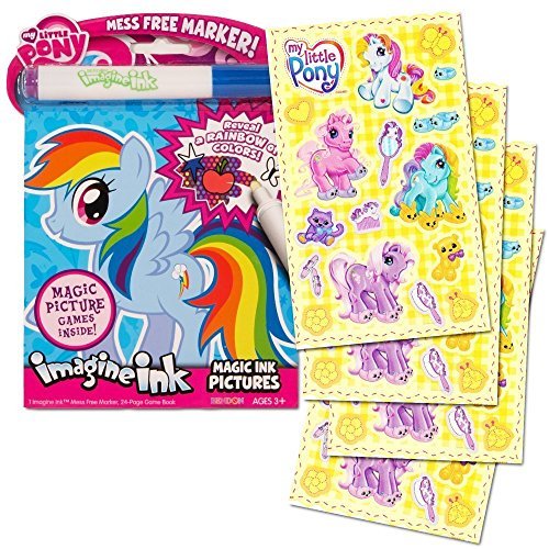 Imagine Ink mess-free picture book set featuring My Little Pony--Rainbow Dash, Fluttershy and more! The set features My Little Pony in an Imagine Ink picture book, plus 1 mess-free Imagine Ink Marker and 2 sheets of repositional My Little Pony stickers.The Imagine Ink picture book uses a mess free marker to reveal a rainbow of colors as you draw on the page. Designed to be used with the included Magic Ink Marker, a clear marker that will not visibly mark most other items. Perfect for travel and on-the-go fun. Great fun for any little My Little Pony fan! Great as My Little Pony party supplies and party favors.Feature