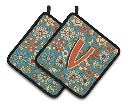 Caroline's Treasures Letter V Flowers Retro Blue Pair of Pot Holders CJ2012-VPTHD, 7.5HX7.5W, Multicolor