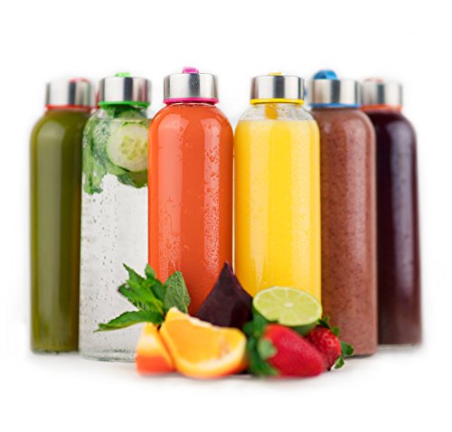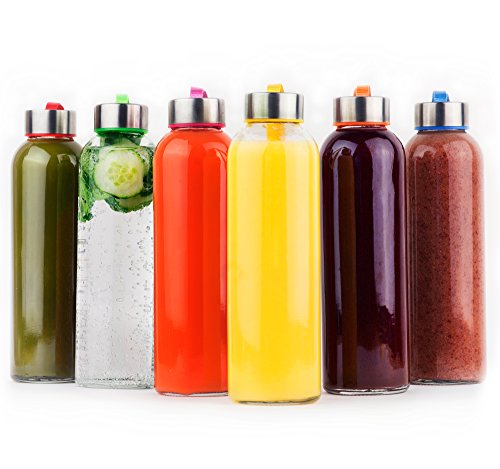 Vremi 18 oz Glass Water Bottle 6 Pack - Glass Bottles with Lids for Juicing or Beverage Storage - Set of 6 Glass Beverage Bottles - Clear Reusable Bottles Stainless Steel Caps Colored Carrying Loops
