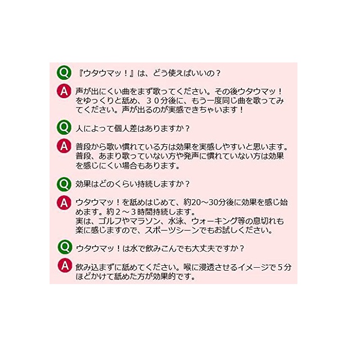 ■Q:《우타우맛》!서는 어떻게(아무리) 사용하면 좋은거야? A:목소리가 출어려운곡을 우선 불러 하십시오.그 후,《우타우맛》!를 느긋한 #고, 한번 더 불러 봐 하십시오. Q:인로 인해 개인차는 있습니까? A:평상시부터 노래해 익숙해져 있는 분은 효과를 실감하여 쉬우면 생각합니다.평상시 남짓 불러 않은 분이나 발성에 익숙해져 않은 분은 효과를 느껴 어려운 경우도 있습니다. Q:효과는 어느 정도 지속합니까? A:《우타우맛》!를이 #기 시작하고, 약20~30분후에 효과를 느껴 처음,약3시간 지속합니다.