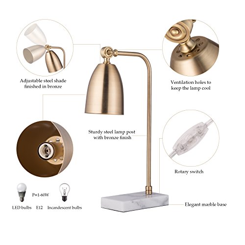 CO-Z Modern & Antique Gold Desk Lamps, Marble Base & Adjustable Metal Shade with E12 Bulb, 18.25 Inches Height for Desk Table Reading
