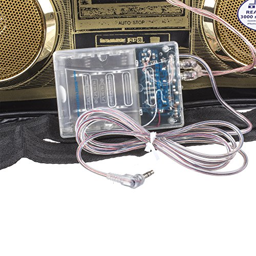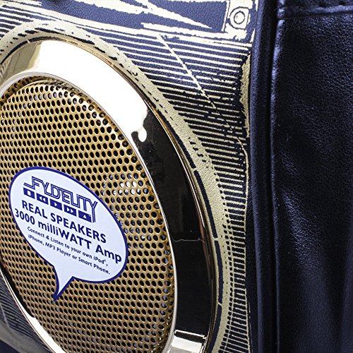 -. Feature : Built-in Stereo Speakers and 3000 milliWATT amplifier / Connects to any Smartphone or Table with 3.5mm headphone jack / 8+ hours of play back from 4 x "AA" replaceable batteries / Fully Functioning Bag / Splash Resistant Speakers