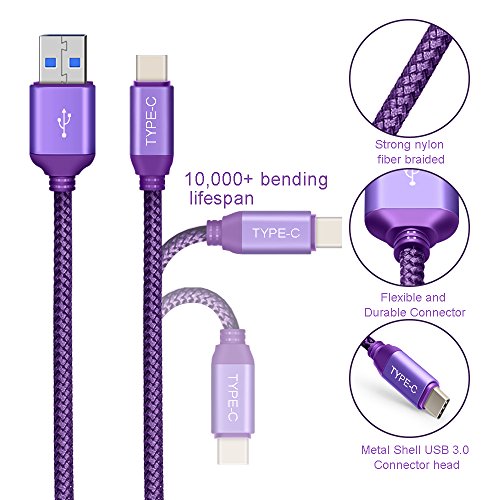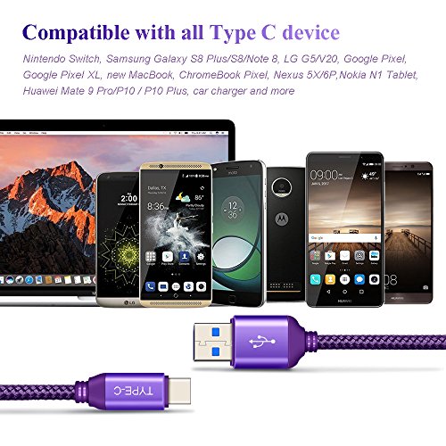Jiunai USB 3.0 Type C cable supports all USB-C connector for Charging and Data Sync: Samsung Galaxy S8, S8 Plus, Note 8 Huawei P9, P9 plus, P10, P10 plus, Mate 9 LG V20, G5, G6 Nexus 5X, Nexus 6P Nintendo Switch Moto Z/Z Force New Macbook, New Macbook Pro Google Pixel C, Chromebook Pixel, Google Pixel/Pixle XL GoPro Hero 5 Nokia N1, ZTE Axon 7 Nextbit Robin, HTC 10 OnePlus 2/3/3T Lenovo Zuk Z1/Z2 HTC 10 and other USB 2.0/3.0 Type-C devices. Package List: 3 X Jiunai 6.6Ft USB 3.0 Type C Cable Nylon Braided Cord Purple 0