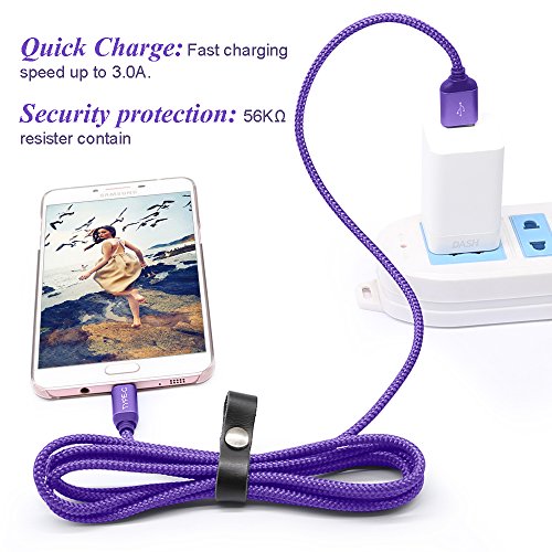 Durable and Tangle Free 6.6Ft USB C Nylon Braided Cord: Strong and durable Type-C nylon braided cable with leather strap to prevent?knotting and fraying. Tangle free design cord supports more than 10,000 bending. The rubber end has a flexible and on each tip well below the tip to be exact, it allows to flex slowly over a wide area instead of one spot so the cords won't break as quickly with use.