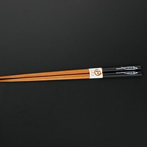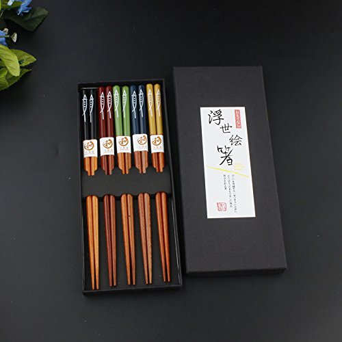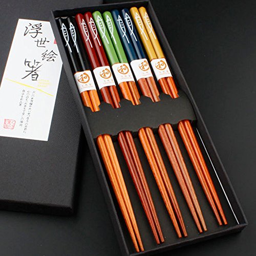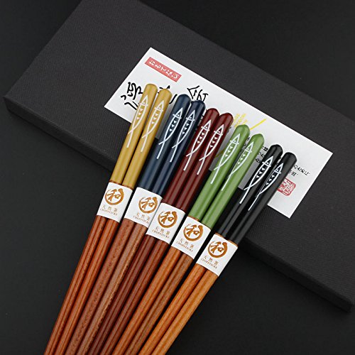 Japanese Chopsticks, Multicolored Fish Pattern Reusable Natural Wood Chopstick set for 5 pairs with gift box