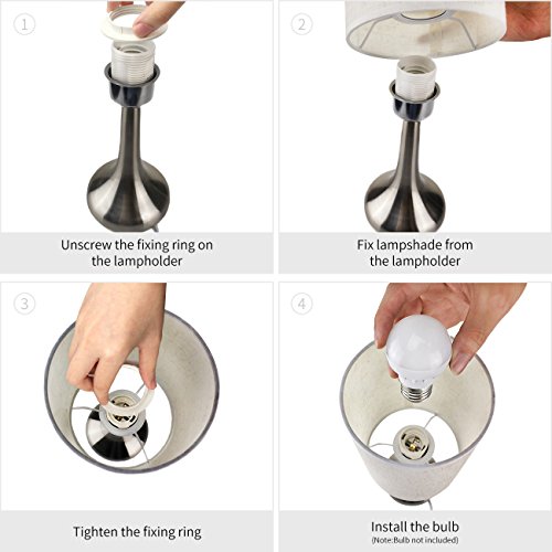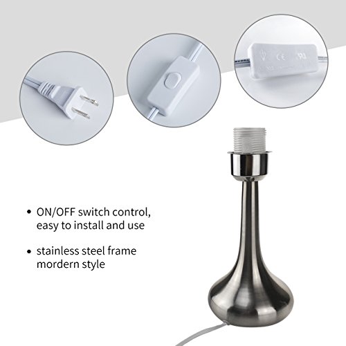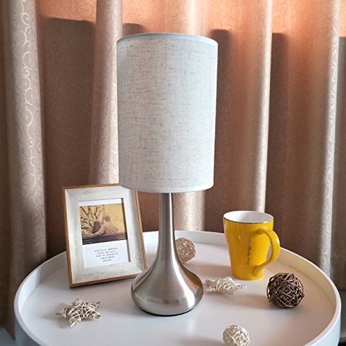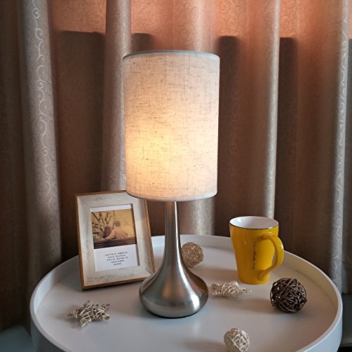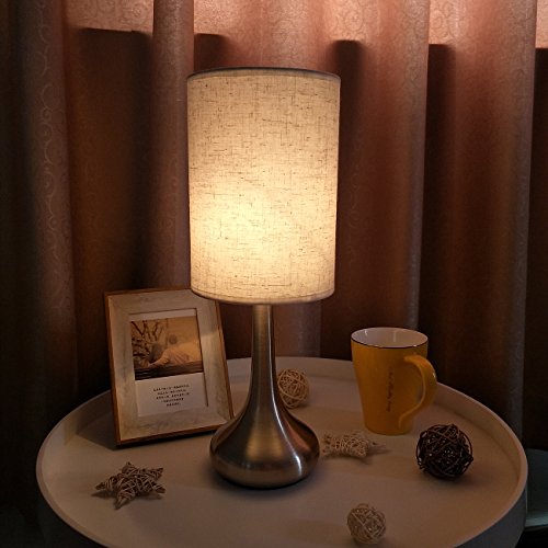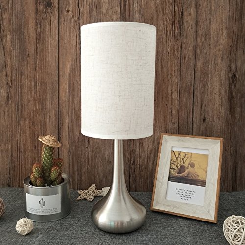 WARM BRIGHTNESS AND UNIQUE SHAPE: It gives off warm light to light up any corner of your home and gives you comfortable atmosphere; Combination of modern bright nickel droplet shape stand and fabrics shade is a unique and fashionable shape