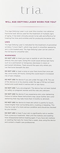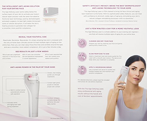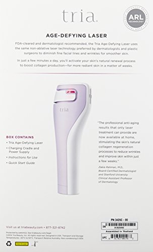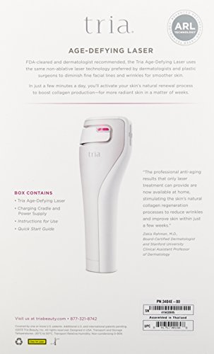 -. Binding : Health and Beauty -. Brand : Tria Beauty -. Feature : The only FDA-cleared, at-home technology currently available for use on your entire face / Named a Skin-Care Game Changer by Allure Magazine / Smooth hard-to-treat wrinkles in the comfort of your own home and see results in as little as 2 weeks / Provides professional-level anti-aging results at a fraction of the cost / Easy to use, only takes a few minutes each night to achieve younger-looking skin -. Label : Tria Beauty Inc. -. Manufacturer : Tria Beauty Inc. -. PackageQuantity : 1 -. ProductGroup : Prestige Beauty -. ProductTypeName : BEAUTY -. Publisher : Tria Beauty Inc. -. Studio : Tria Beauty Inc. -. Title : Tria Beauty Age-Defying Laser, 4.5 lb.