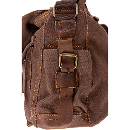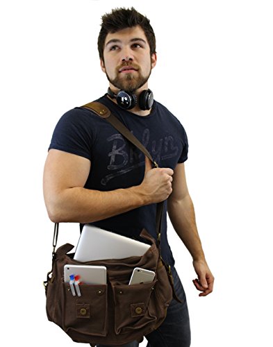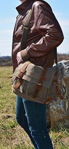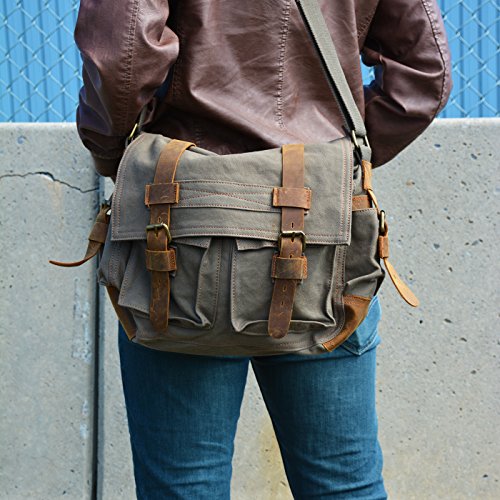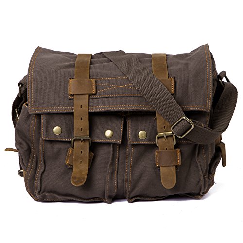-. Brand : HDE -. ClothingSize : One Size -. Department : Mens -. Feature : Classic canvas messenger bag with reinforced synthetic leather straps / Two large front pockets and two smaller side pockets; Fits 13" laptops / Features a two-tone style with vintage "washed out" look; Antique finish brass metal buckles / Dual leather straps with magnetic quick snap for easy access / Perfect for hiking, school, travel, or preparing for the zombie apocalypse -. ProductGroup : Sports -. ProductTypeName : OUTDOOR_RECREATION_PRODUCT -. Size : One Size -. Title : HDE Vintage Canvas Military Tactical Ammo Style Shoulder Messenger Field Bag
