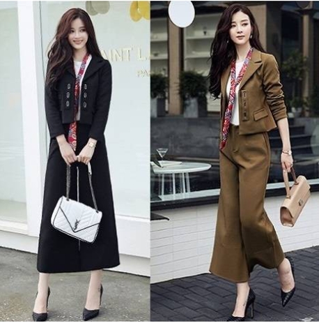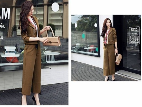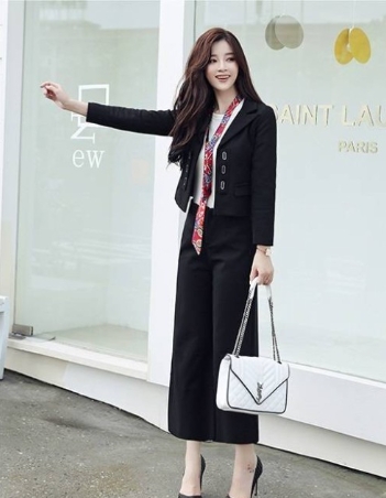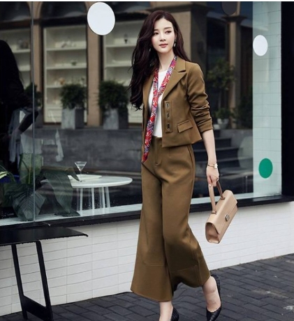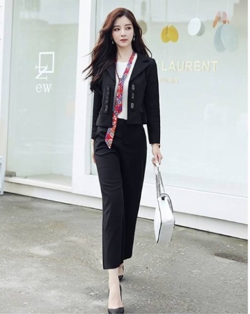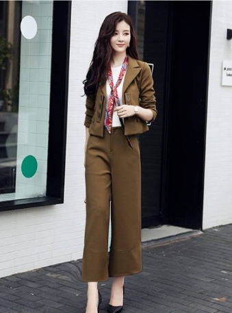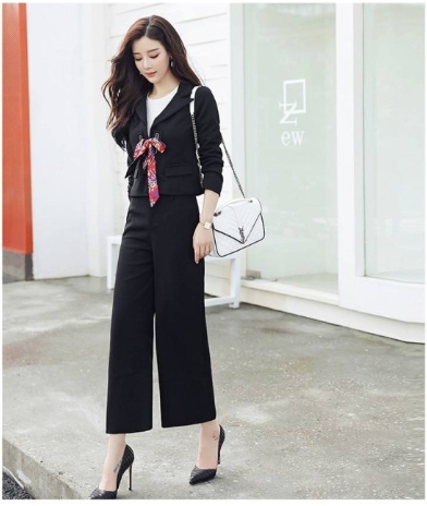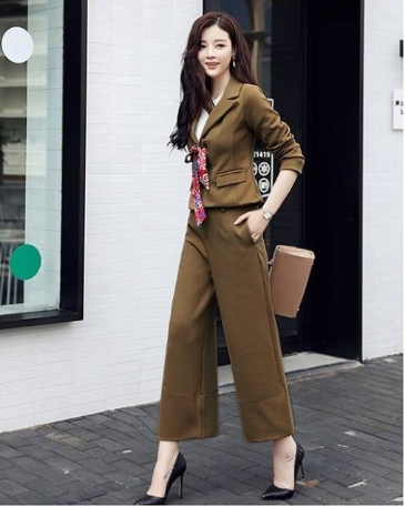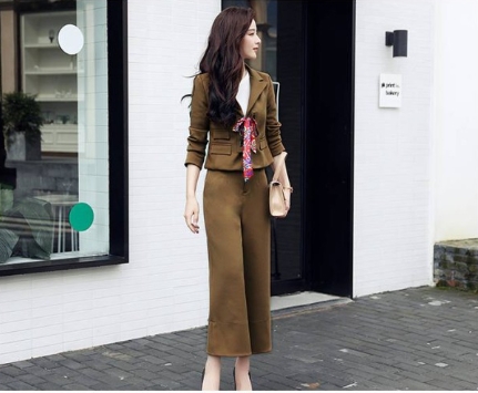 スカーフ使いがアクセントになっている、ソリッドカラーのパンツスーツ!