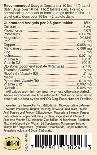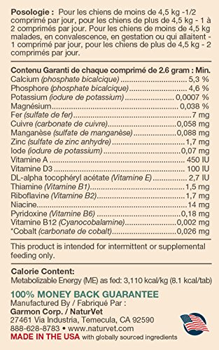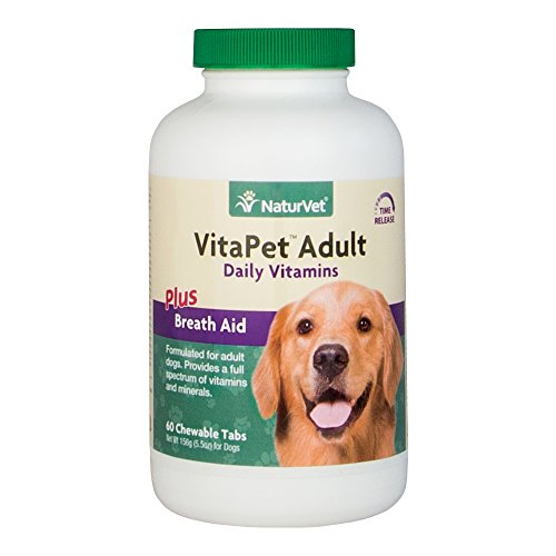 NaturVet VitaPet Adult Daily Vitamins Plus Breath Aid for Adult Dogs Provides a Full Spectrum of Essential Vitamins and Minerals. Plus Breath Aid to Help Freshen Breath. Time Release, Chewable Tablets 60ct for Adult Dogs One Year and Older. Give Sick, Convalescing, Pregnant or Nursing Dogs Double the Daily Suggested Amount. Guaranteed Analysis per 2.6 Gram Tablet: Calcium, Phosphorus, Potassium, Magnesium, Iron, Copper, Manganese, Zinc, lodine, Vitamin A, Vitamin D3, DL-alpha-tocopheryl acetate (Vitamin E), Thiamine (Vitamin B1), Riboflavin (Vitamin B2), Niacin, Pyridoxine (Vitamin B6), Vitamin B12 and Cobalt. All NaturVet Products are Veterinarian Formulated and Manufactured in the USA in an FDA Audited, cGMP Compliant Facility with a 100% Satisfaction Guarantee.Feature
