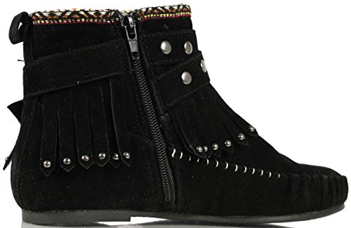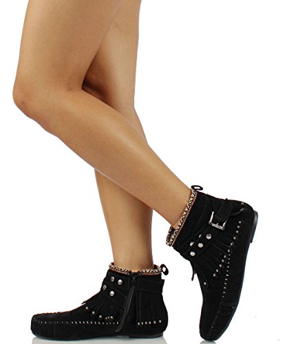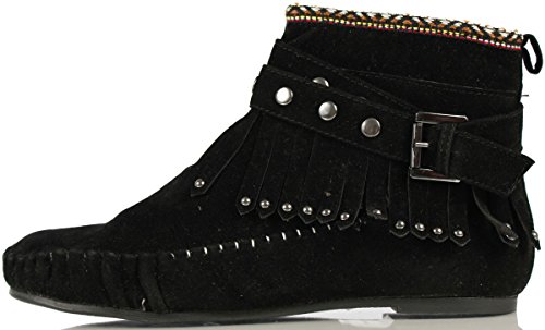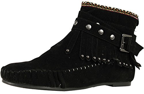 Binding : Apparel Product Description Get ready for fall fashion with these cute faux suede ankle Moccasins. They feature a metallic accents, fringe ankle accents . tribal stitched design on upper top ,adjustable strap, stitched toe , rubber sole and a side zipper for easy on. Pair these cuties with your favorite skinny jeans and tee.O 0