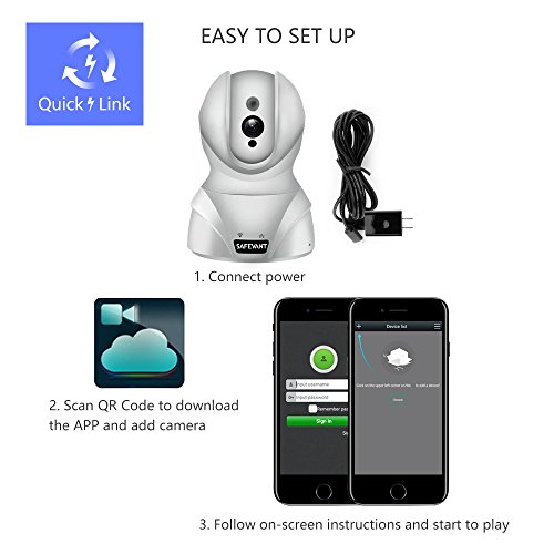 -. Feature : STUNNING 360° FULL VIEWING EXPERIENCE: Adjustable Pan/Tilt move the camera as you desired. Pan horizontally up to 350°, tilt vertically up to 100° give you a full view of any room. Moreover, 8 time digital zoom makes it happen that viewing all details as you like. Super Hi-Vision AR lens capable of streaming video at 1280 x 720p HD quality, the image is very clear and exquisite. / DATA PROTECTION AND REAL TIME MONITORING: Free apps for Android and iOS, seamlessly stream video directly to your smartphone, tablet and PC. On the premise of keeping your data safe, 1024bits financial level cloud encryption technology applied to make sure the safety and reliability of your video transmission. / TWO-WAY TALK AND VERSATILE INSTALLATION: Stay in touch with built-in speaker and mic, listening and responding to what is going on while watching. Tell your dog to get off the couch or tell intruders that the police are on the way. 360-degree omni-directional voice collecting, professional speech processing chip reduce background noise and improve audio output. Versatile installation allows you place the camera where it suits you best including vertical, wall mount or ceiling. / 24/7 LIVE SURVEILLANCE AND MOTION DETECTION: App alerts with snapshot & record(Micro SD Card Required) to your mobile device when motion is detected. Also, motion detect sensibility, schedule recording and alerting can be adjusted by yourself. Continuous day/night surveillance is accomplished by IR-CUT smart system, powerful IR-LED for night vision up to 32ft. NOTICE: MICRO SD CARD REQUIRED (up to 64g) TO RECORD, NOT INCLUDED IN THE PACKAGE. / EASY TO SETUP: Simply plug in the power cable, download the app and add device by following on-screen instructions in just minutes. Quick Link Tech introduced and adopted to Safevant IP camera in order to build a more powerful WIFI signal coverage and make the connection quick and easy. NOTICE: Safevant IP CAMERA IS A 2.4ghz SUPPORTED CAMERA, NOT SUPPORTING 5ghz NETWORKS. Any concerns, our support team is available at 1-866-380-1888.