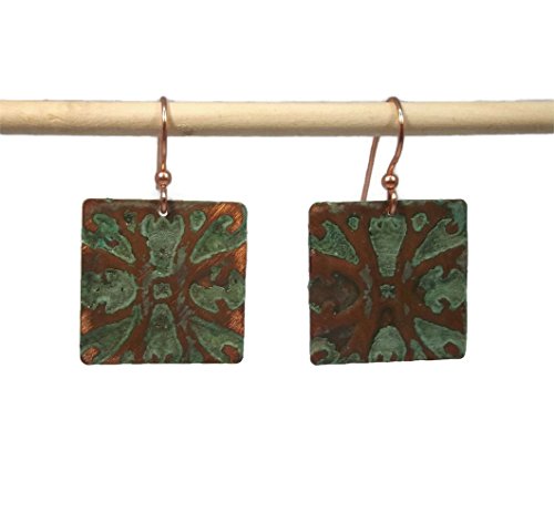 -. Title : 1-1/2" Square Embossed Copper Patina Dangle Drop Earrings, OOAK, One of a Kind