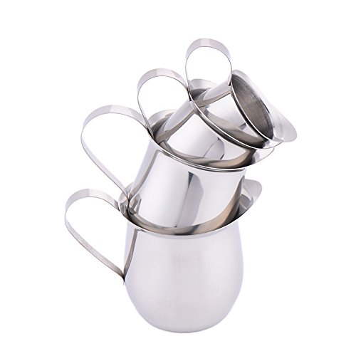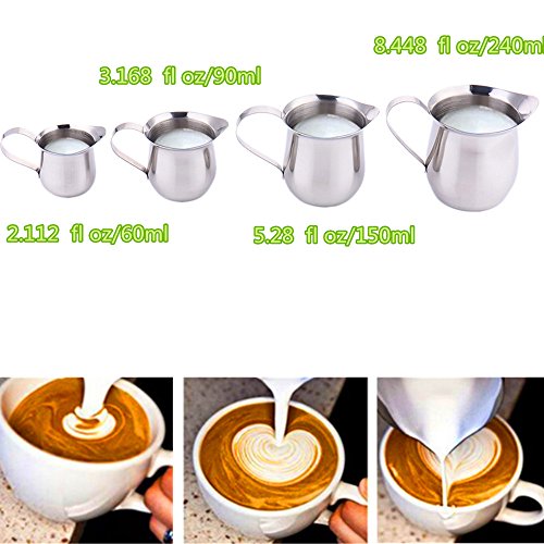 Help you turn your milk or cream into rich, delicious, fluffy foam; works perfect with hand held milk frother or milk steamer, best for daily use. 1. Material: Stainless Steel 2. Color: Silver 3. Perfect for preparing coffee such as latte, cappuccino. 4. Widely used in Coffee shop, western restaurant, bar etc. 5. A must have for any coffee enthusiast. 6. Seamless design with pour spout. 7. Mirror surface treatment, smooth and glossy. 8. Size: Style 2oz/60ml: about 7.8 * 4.3 * 4.5 (cm) / 3.07 * 1.69 * 1.77 (inch) Style 3oz/90ml: about 8.5 * 5.5 * 5.6 (cm) / 3.35 * 2.16 * 2.20 (inch) Style 5oz/150ml: about 10.5 * 6.3 * 7 (cm) / 4.13 * 2.48 * 2.75 (inch) Style 8oz/240ml: about 11 * 7.2 * 8 (cm) / 4.33 * 2.83 * 3.15 (inch) Package include:1 x Frothing Jug 0