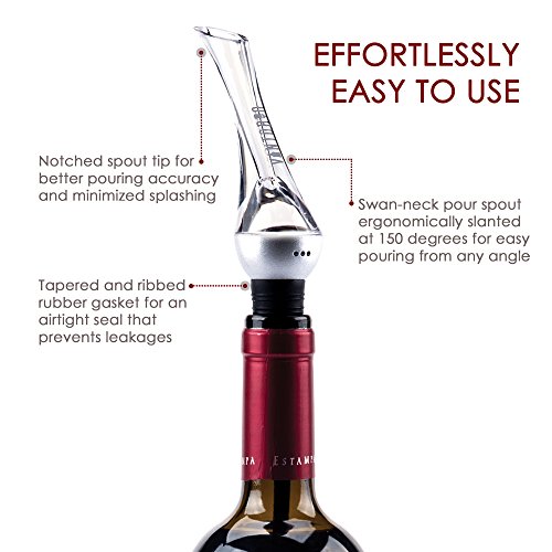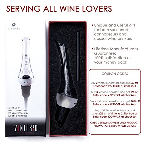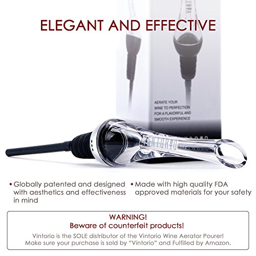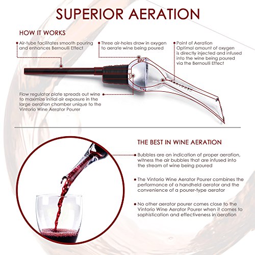 -. Binding : Kitchen -. Brand : Vintorio -. Feature : AERATE YOUR WINE TO PERFECTION INSTANTLY - The Vintorio Wine Aerator Pourer has a large aerating chamber and air intake system that utilizes the Bernoulli Effect to infuse your wine with the OPTIMAL amount of oxygen. Double the value of your wine by simply pouring yourself a glass! / KEEP YOUR TABLECLOTH SAFE FROM WINE STAINS - The rubber stopper is tapered and ribbed to create a leak-free seal for wine bottles of all sizes and the acrylic pour spout is notched and ergonomically slanted for easy drip-less pouring. The aerator can be disassembled and run under water for effortless cleaning. / ELEGANTLY DESIGNED AND MADE WITH QUALITY MATERIALS - The Vintorio Aerating Pourer is manufactured with high quality FDA approved materials. Its elegant design will add a level of refinement to your wine drinking experience and is the perfect gift for wine lovers. / SEE WHAT OUR CUSTOMERS HAVE TO SAY - "This product needs to be in every household in the world... I was really blown away by quality demonstrated in every facet of the product. I cannot drink wine anymore without the Vintorio Aerator."- Edward "It made a $12 bottle of red wine taste like $25 bottle of wine :)" - sm354 / LIFETIME MANUFACTURER'S GUARANTEE - To prove how confident we are in our product, we offer a lifetime money back guarantee with every purchase! If you are not completely satisfied with your aerator, we will refund your purchase with no exception! The Vintorio Aerator Pourer is On Sale for a Limited Time Only! Click the Add to Cart Button Now! (*Beware of counterfeit products, Vintorio is the SOLE distributor of the Vintorio Wine Aerator Pourer) -. IsAutographed : 0 -. Label : Vintorio -. Manufacturer : Vintorio -. Model : VAP -. ProductGroup : Home -. ProductTypeName : HOME -. Publisher : Vintorio -. Studio : Vintorio -. Title : Vintorio Wine Aerator Pourer - Premium Aerating Pourer and Decanter Spout