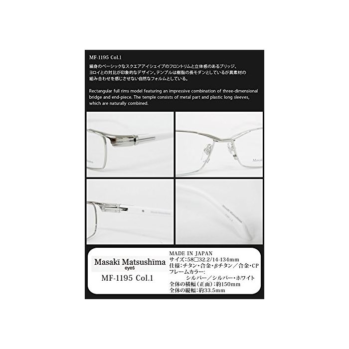 원본상품명: (マサキマツシマ)薄型非球面レンズ付 Masaki Matsushima MF-1195 Col.1(シルバ/シルバホワイト)レンズ付メガネセット(度付き)