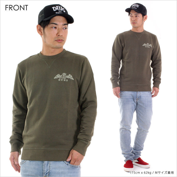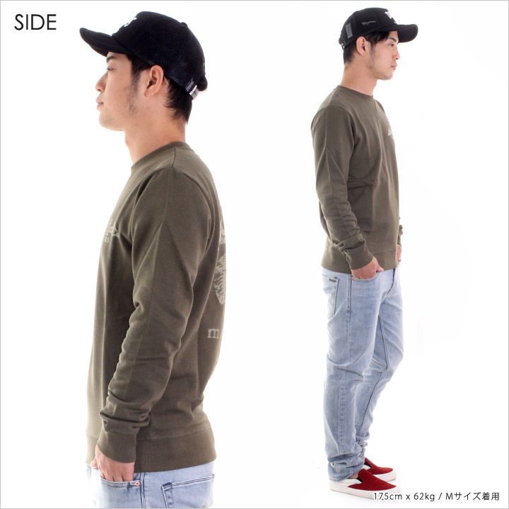 日本人体型に合わせすいレギュラーフィットのスウェット。 オリーブカラーに栄える独特な風合いのプリントが程良いヴィンテージ感を演出。 また、薄手の裏起毛ライナーで初秋など季節の変わり目に最適な着心地がオススメポイントです。 ダメージデニムやカーゴパンツなど無骨なパンツスタイルとの相性もバツグンで、気軽にルードファッションも楽しめます。