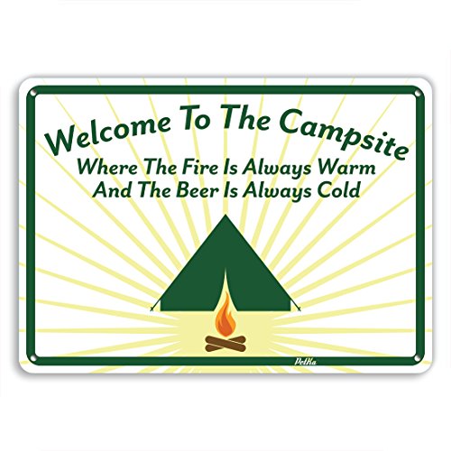 PetKa Signs and Graphics PKCA-0005-NA_10x7 "Welcome To The Campsite Where The Fire Is Always Warm And The Beer Is Always Cold" Aluminum Sign, 10" x 7", Green Text with Text