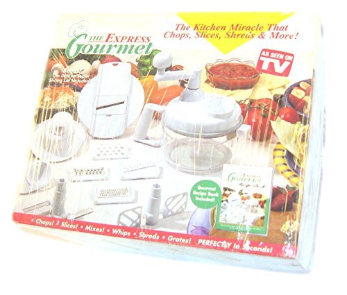 Great for your favorite cakes and cookies. Use for pancakes, pastries, sauces, batters, and all your favorite recipes, ideal to make your favorite drinks anytime. Fantastic for shakes, smoothies and diet drinks. Chop meat, onions, no crying! great for vegetables, nuts, potatoes and fruits, attach chopping blades. Close lid and turn. Use for salsa, browns, bruschetta, guacamole and other dips. Attach mixer-blender-whipper. Close lid and turn. Use for omelets, scrambled eggs, whipped cream, and diet drinks. Express Gourmet is a special machine which can cut any kind of vegetables, like carrots, lettuce, cabbage, etc. Express Gourmet contains heavy duty blades, which can cut ten to twenty times faster than by hand. You can use Express Gourmet to make your own salsa, sauces, salad, or anything you like to make!Feature