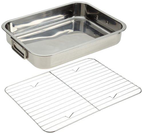 Stainless steel roasting/lasagna pan features removable chrome plated wire rack