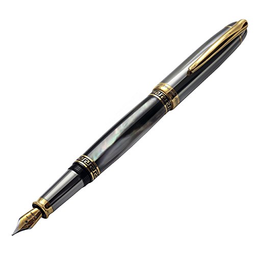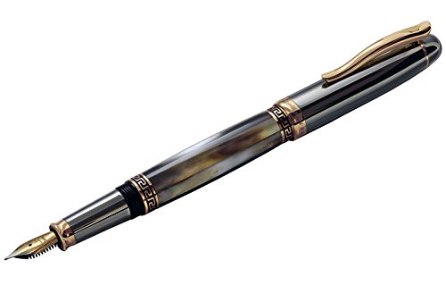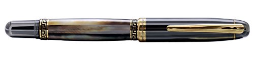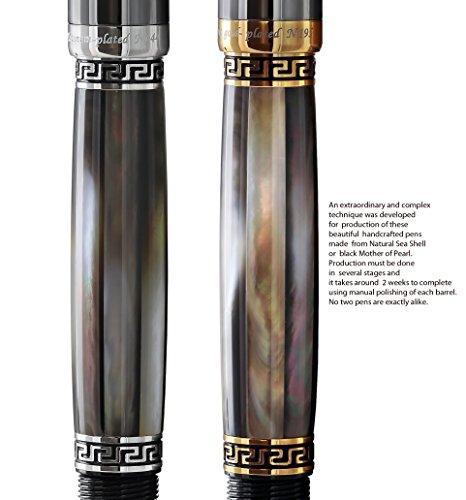 -. Feature : Supplied with gift box, (4) ink cartridges, cloth, ink converter, certificate, 3-year warranty card. Standard size ink cartridge is interchangeable with montblanc, waterman, sheaffer, s.t. dupont, Visconti, pelican, delta, omas, aurora, ink refills / Handcrafted with long panels of natural Tahitian Iridescent Black Mother of Pearl (barrel). Some distinctions in the texture of Black Mother-of-Pearl material may occur. These distinctions and variations in texture and color add beauty to each of the pens / MEDIUM nib. Fittings are made of solid brass. The 18-karat gold plated parts are hallmarked. Hand-etched Greek key bands on the barrel. Solid brass cap and parts are painted in tungsten metallic color and sealed with translucent lacquer for protection / In order to produce the silky smooth finish and the richness of the colors, the barrels are manually polished in several stages. The Iridescent Black Mother-of-Pearl panels range from gray to black with red, green or blue overtones. NO TWO PENS ARE ALIKE / Each pen is individually numbered. Screw-on cap with handcrafted curved clip. Weighty, balanced body. Diameter: 13 mm, length posted: 172 mm, length capped: 147 mm. Suitable for Men with M to X-large size hands or for Women with L to X large size hands