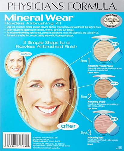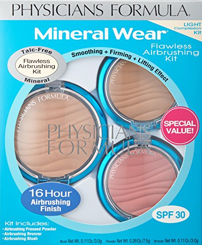 -. Title : Physicians Formula Mineral Wear Flawless Airbrushing Kit, Light Complexion SPF30 - Airbrushing Loose Powder: 0.26oz, Airbrushing Bronzer: 0.11oz & Airbrushing Blush: 0.11oz