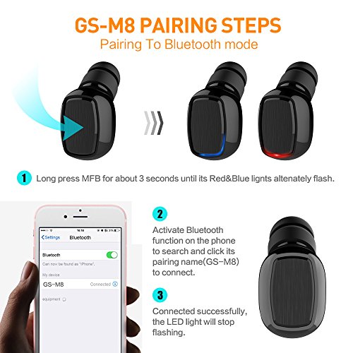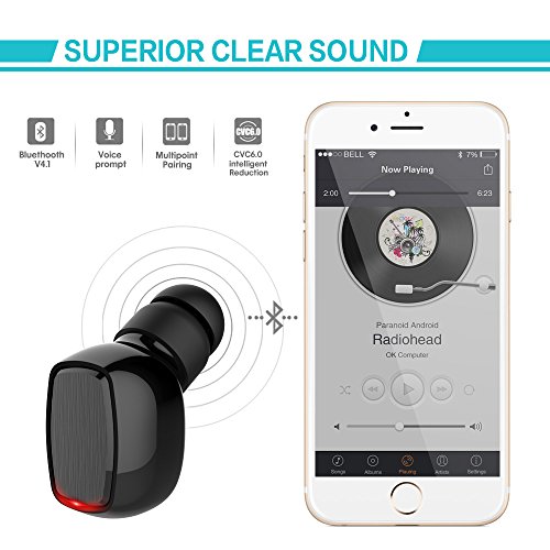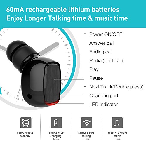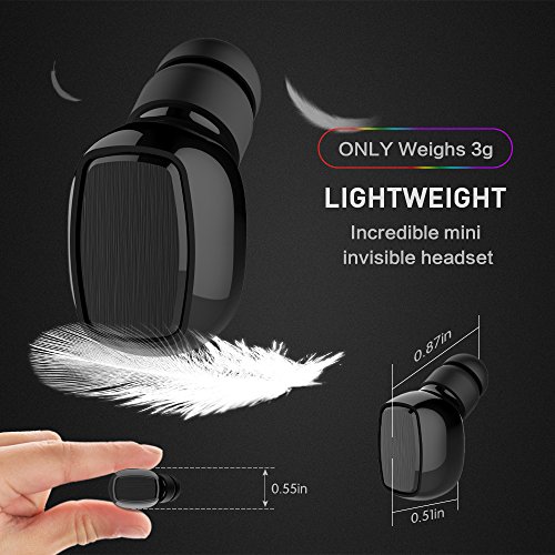 -. Feature : COMFORTABLE & SECURE FIT: Ergonomic design, no troublesome wires from tangling or around your neck. Super mini Bluetooth earbud, ultra lightweight, only 3g/0.11oz, lighter than a coin, you'll hardly notice it's there. NOTE: This earbud is just single one, not a pair, suitable for both left or right ear. / BLUETOOTH V4.1 WIRELESS TECHNOLOGY: Provides a faster and more efficient connection with fewer delay. Connected with two devices at the same time, the wireless range up to 33 ft (10 meters) without obstacle. Compatible with most Bluetooth enabled devices such as iPhone7/7 Plus, 8/8 Plus, X, iPad, iPod touch, Samsung Galaxy S7 S8 Note 8 Smart Phones, tablets, etc. / CRISP & CLEAR SOUND: Features CVC 6.0 noise cancelling technology and built-in HD microphone, no annoying flash light, more hidden, ideal for hands free calling, listening to music, news, etc. Easily to answer/end calls, play/pause music through the multi-function button. / LONG BATTERY LIFE: with built-in high performance 60mAh polymer battery, provides up to 6 hours talking time, 4-6 hours music time (The headphone playtime varies according to volume level and audio content), 1~2h charging time. Support IOS device power display. / WHAT YOU GET: 1*mini bluetooth earbud + 1*USB charging cable + 2*eartips + 1*Carrying zipper case + 1*user manual + 12 months Worry-Free Warranty + 24-hours email contact service. Please let us know if you have any questions or concerns, we're standing by to assist you all the time.