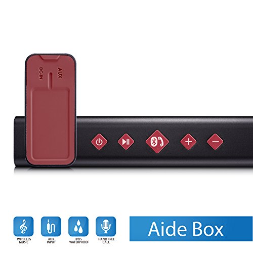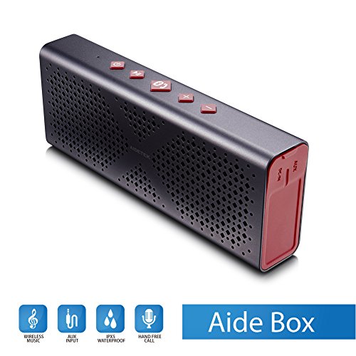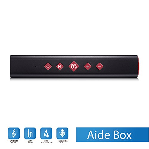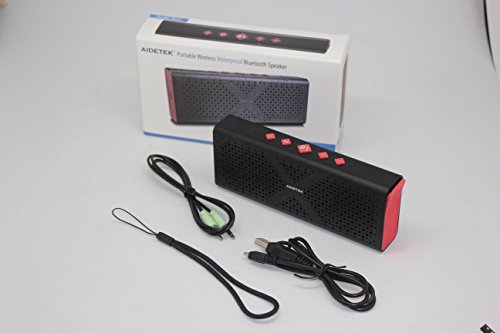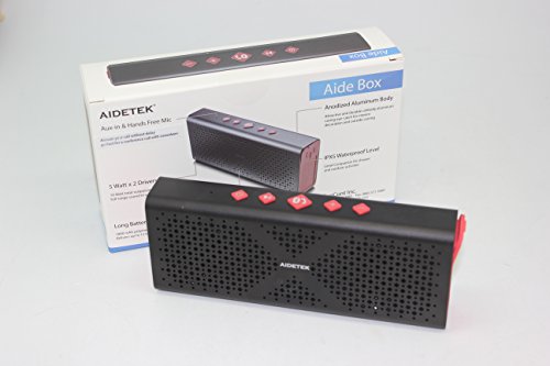 -. Feature : Fashionable and stylish design with Ultra-Portable Aluminum solid performance and universal compatibility Wireless Bluetooth speaker / IPX5 waterproof speaker, the great companion for showers, baths, swimming pools, boats, marine, cars, etc. / Built-in 3.5mm audio line in and 1800mAh rechargeable battery allow 15+ Hours Battery Life, from 33 feet of distance / QUALITY SOUND: 10W speaker driver output with deep-bass and crystal clear sound, full-range sound you might not expect from a compact speaker / The AidtekBox Bluetooth speaker can connect to two Bluetooth devices at the same time, letting you switch between them quickly-when the first device stops playin.ProP.R.Ietary technologies and a unique design produce clear, well-balanced, full-range sound. More features: Auxiliary input enables you to connect to other audio sources, like a tablet or MP3 player, Charges with most Micro