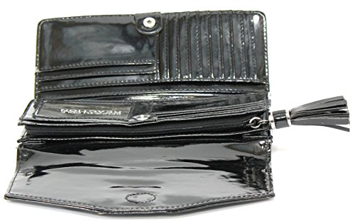 -. Feature : Embroidered "Kenneth Cole Reaction" lettering over fabric / Glossy PU / manmade interior / 7.5" L x 4.5" H x 1" D / Embellished with a tassle zipper tab / Interior features 16 card slots, zip gusset pocket,� bill pocket, 1 ID pocket, 1� extra gusset pocket