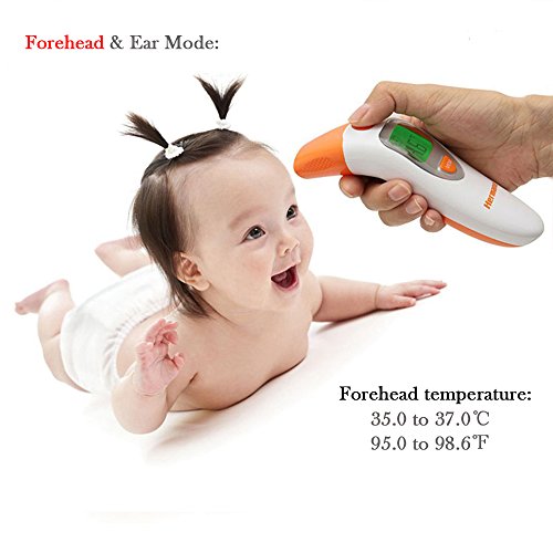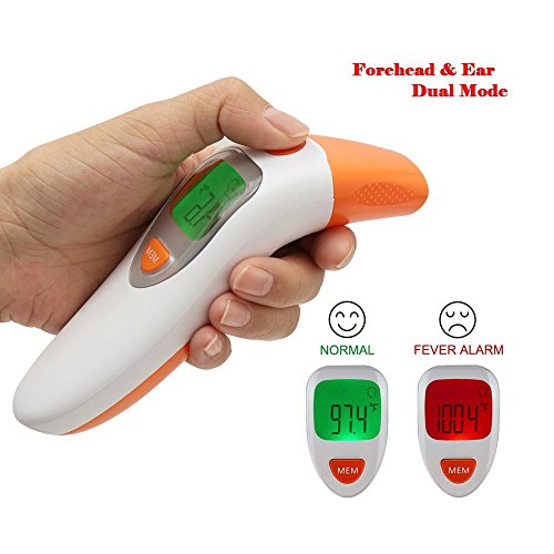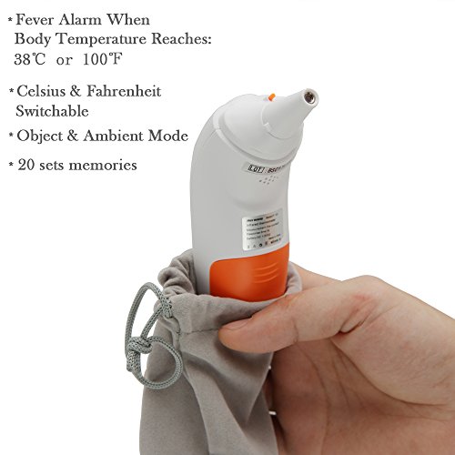 * Contact-type infrared measurement thermometer with Instant Reading in 1s * Forehead, ear and object temperature, three modes of measurement * High definition dual color LED backlist, clearly and softly display * Fever alarm function (Sound alarm function when reaches to 38℃ and above) * Capacity of storing 20 sets measurement * Dual temperature units:"℃" and "℉" optional * Auto power off in 30s when idle