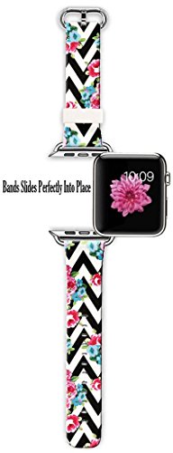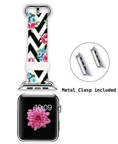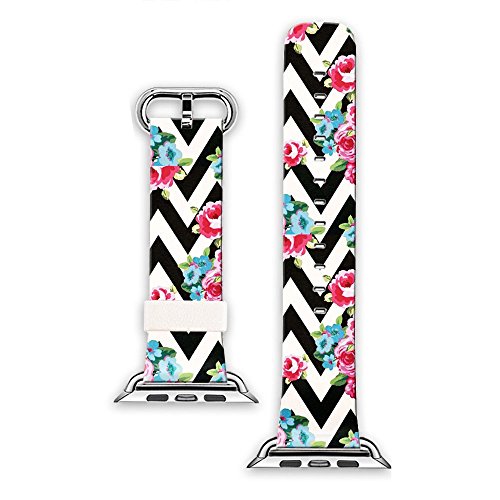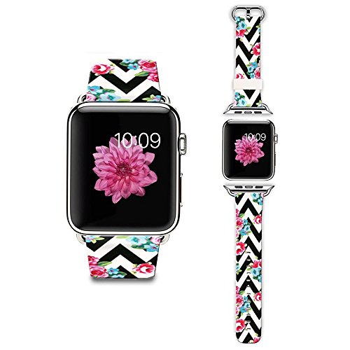 Apple Watch Strap Apple Watch Band 42mm Genuine Leather Strap Wristband With Free Adapters for Apple Watch/ Sport/ Edition 42mm-Chevron Black and white flowers