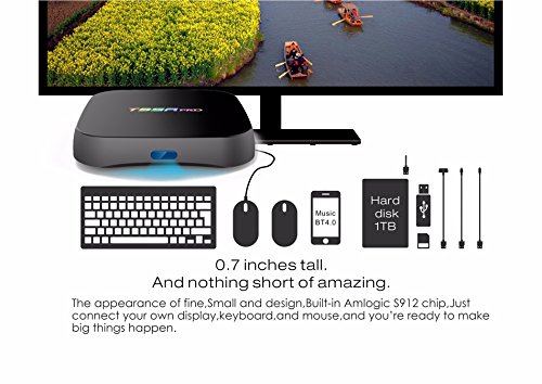 -. Feature : Latest Chipset Amlogic S912 with Octa-Core Cortex-A53 64bits up to 2GHz Ultra high frequency / Android 6.0 Marshmallow OS: Newest and openest OS / 2G RAM(DDR3) + 16GB(EMMC): Bigger, Faster, Stronger / Dual Band WIFI 2.4G/ 5.0G + Bluetooth 4.0 / Support 4K x 2K H.264/H.265 60fps HDMI 2.0, 4K Ultimate HD vedio hardware,4K 1080i/p resolution, 4 times of full HD