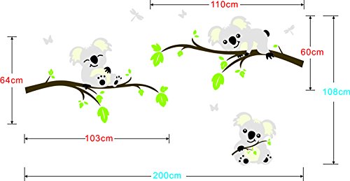 -. Binding : Kitchen -. Brand : eS -. Color : Grey, White, Green -. EAN : 0623952770335 -. Feature : Size: 200CM Width X108CM Hight; / Material: PVC; / Applies to any smooth and dry surface; / Removable and repositionable with no sticky residue; / Come with Installation Instructions and transfer film. -. IsAutographed : 0 -. Label : E.S -. Manufacturer : E.S -. MPN : 4328268635 -. PackageQuantity : 1 -. PartNumber : 4328268635 -. ProductGroup : Home -. ProductTypeName : BABY_PRODUCT -. Publisher : E.S -. Studio : E.S -. Title : E.S Cute Koalas Playing in The Trees Vinyl Decal for Kids Baby Bedroom Removable Art Wall Sticker Home Décor -. UPC : 623952770335