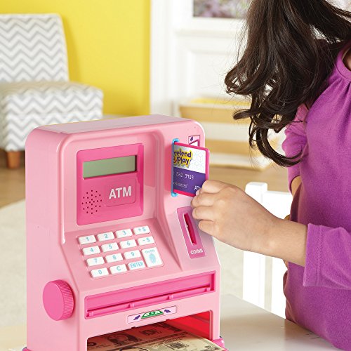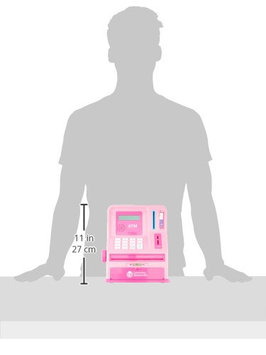 Kids can lean money management early with this electronic teaching ATM. Kids will have hours of fun counting, depositing, withdrawing, and saving with both real and pretend money. Features coin recognition, a mechanical bill feeder, and a pretend thumbprint sensor. Includes play money and ATM card. Large LCD screen measures 2½"L x 2"H. ATM measures 9½"H.Feature