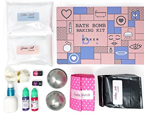 - A SUPER KIT: Everything you need to make 8 Large size spherical bath bombs is in this box. Kit makes 4 Rose and 4 Lavender Bath Bombs. Includes baking soda, cornstarch, citric acid, Epsom salt, natural colorants, sweet almond oil, rose and lavender essential oils, aluminum steel molds, gloves, spray bottle and gift box.