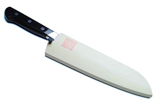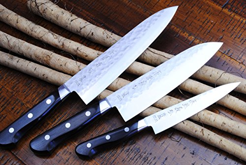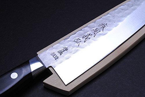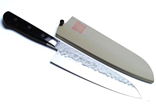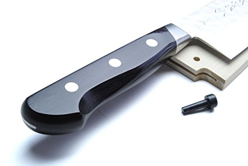 This knife's center core is made of Blue Steel #2 and the outside jackets are made of stain resistant steel. This combination makes the knife easy to maintain and has a sharp edge. It is complete with a beautiful hammered design. The Santoku is a multipurpose knife. The blade is shorter and thinner making it perfect for home cooking or in smaller spaces. It is used to cut meat, fish and vegetables.