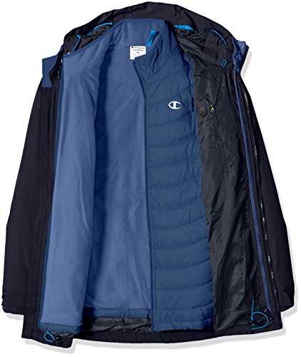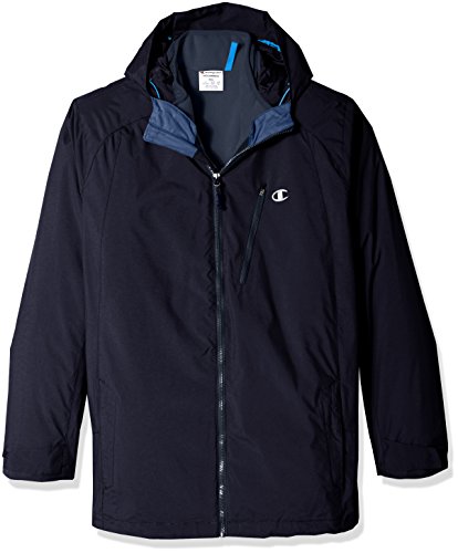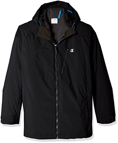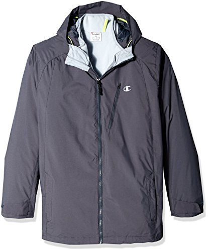 Champion men's big and tall systems jacket: removable featherweight synthetic down liner for fall; DWR (durable water resistant) shell (featherweight) liner for winter; wind and water resistant shell for spring. 3 coats in 1 the shell jacket has a simple elasticized drawcord hood and functionable multi pockets for accessories and trail maps along with a dual adjust drawcord hem to block out the elements. The interior jacket has highly compressed insulation that traps heat as well as a wind and water resistant shell. Interior smart pocket and media portal finish the details of this 3 in 1 systems jacket.