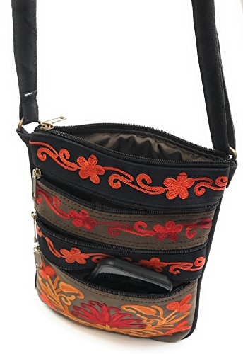All our handbags are meticulously handcrafted and intricately embroidered with brightly colored silk thread. Each bag is a unique piece of art, unlike mass produced, machine made purses. Very roomy for its small size! It has multiple front & back zippered pockets for practical, easy accessibility. A total of five pockets can fit a small wallet, sunglasses, cell phone (including large ones like iPhone 7S Plus), iPad mini/KindleReader, makeup essentials, a small digital camera, passport, paperback novel, keys, cards, and a small bottle of water.Feature