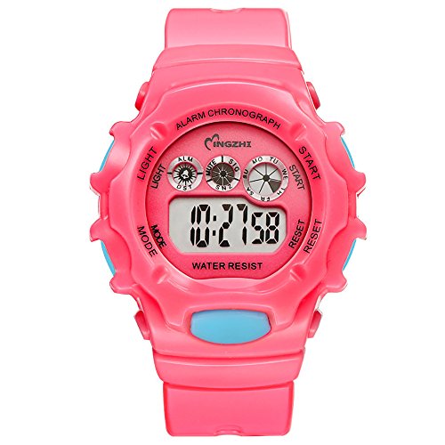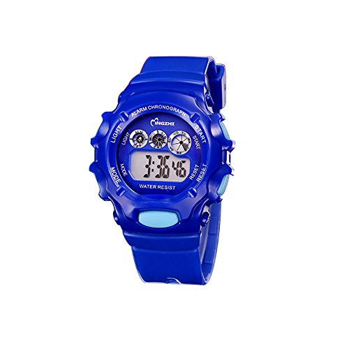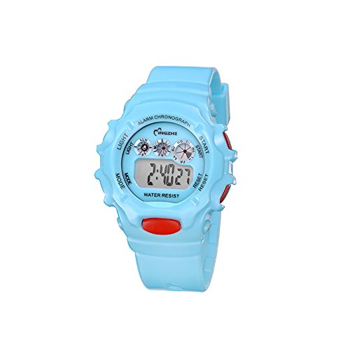 -. Feature : Function: Stopwatch / Date / Week / Time / Alarm / Timing / Military 12H/24H time setting; And Colorful EL backlight, easy to check time clearly in the dark; / Cool kid's sports watch with digital time display, offers the precise and accurate time keeping; Made of ABS resin for watch case, anti-scratch and anti-drop, Suggest for children over 5-year-old and schoolchildren; / 30M waterproof. Need not to take off the watch while washing hands, face, swimming, or in the rain(Avoid the hot water and steam). Meet daily needs. However, do not push the button under the water; / Durable rubber band, no smell, non-toxic, bending freely, preventing sweat, really breathable and comfortable to wear, protect your kids' wrist well; Stainless steel watch clasp, easy to wear or take off, nice gift for both kids and teenager's daily life and outdoor activities; / Best gifts for your children during birthday, festival, party, Christmas, and so on. Comes with a watch box and a spare battery. If you meet any question or problem, please feel free to contact us, we will solve for you all the time.