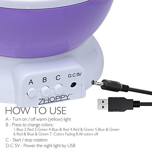 - USAGE: 3 buttons located on the front which labeled A, B and C. A - warm light mode button, can turn the yellow light on and off, B - cycles through color options C - turns on and off the rotating motion option. There are 4 color options, warm light, blue, red and green. You can choose to have one color or multiple colors at one time. Chinese & English Instruction Manual in the Box.