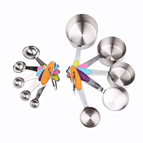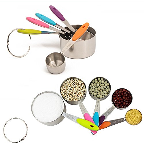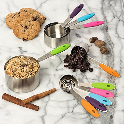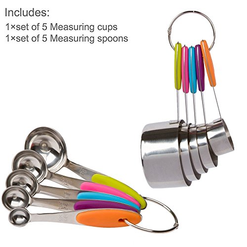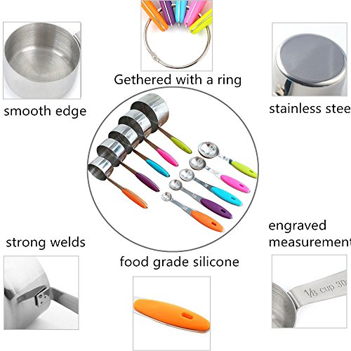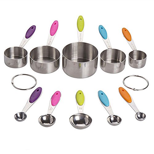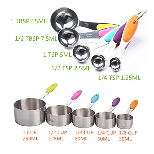 - PREMIUM QUALITY - This 10 pieces measuring cups and spoons set is made of food grade stainless steel with colored silicone handle grip, sturdy and comfortable, features rust proof, corrosion proof.